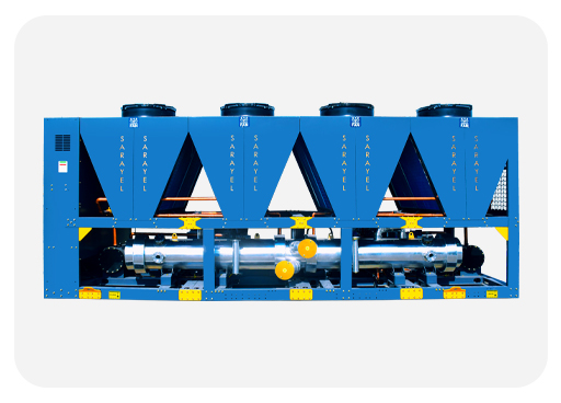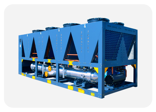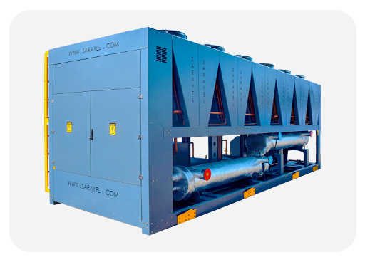 در شکل زیر نمونه ای از چیلر تراکمی هوا خنک طراحی و تولید شده در کارخانه شرکت سارایئل نسیم نشان داده شده است.